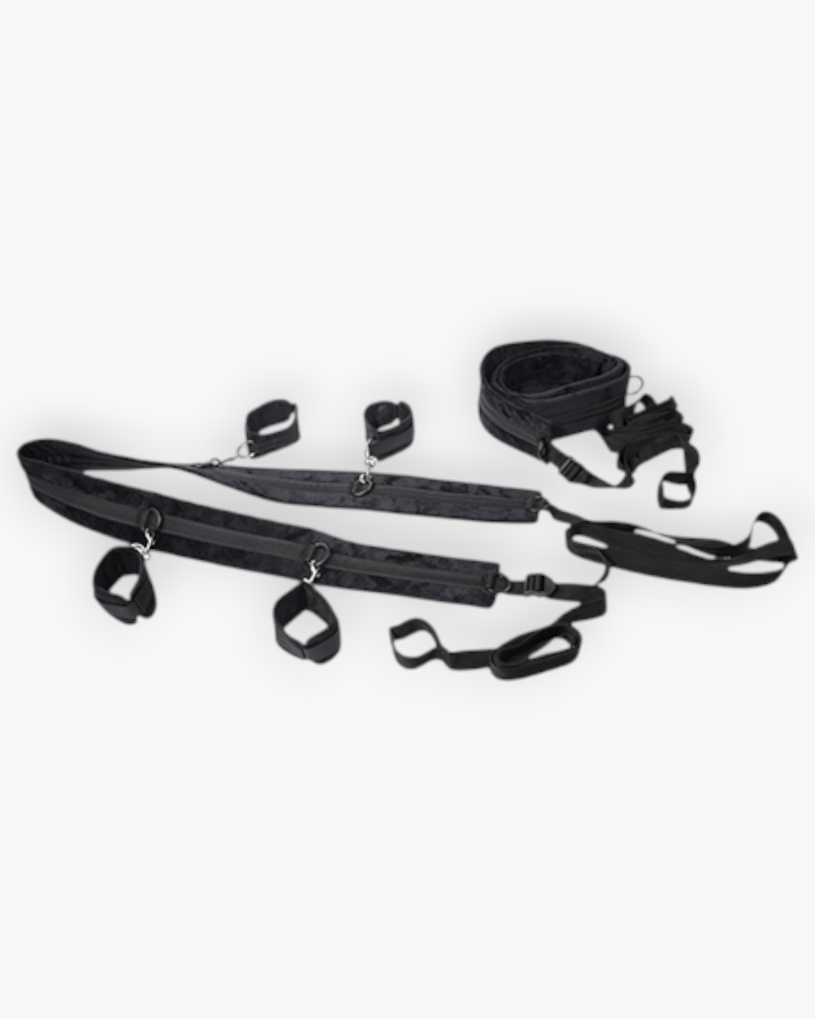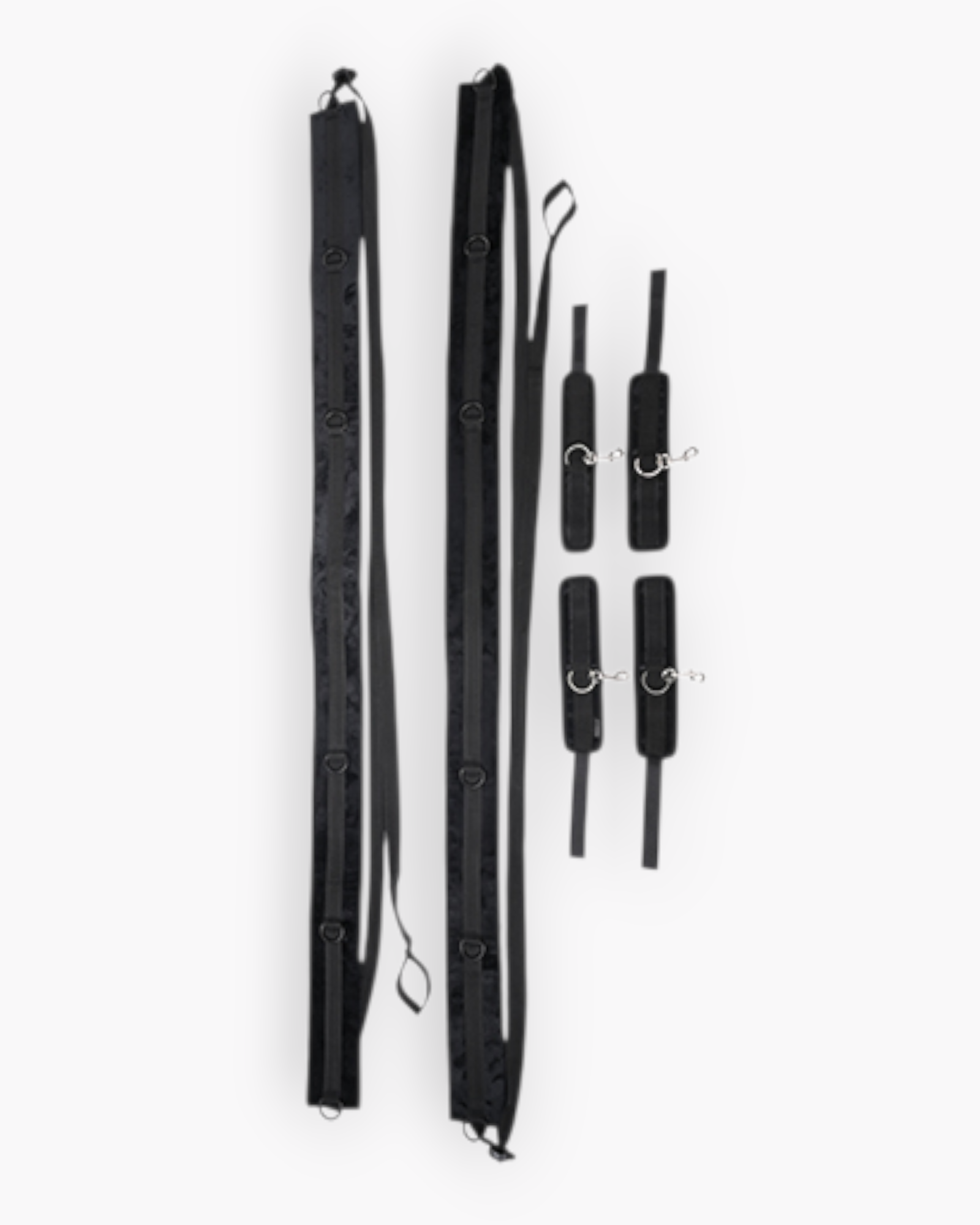 Take control wherever the mood strikes with this ultra-portable, easy to use restraint system. With nearly 10 feet of adjustable strapping, padded webbing, and multiple D-ring connectors, you can transform any space into a scene — from the bedroom to the doorway and beyond. The four included cuffs keep your partner right where you want them, while the padded straps protect both body and furniture for safe, versatile play.